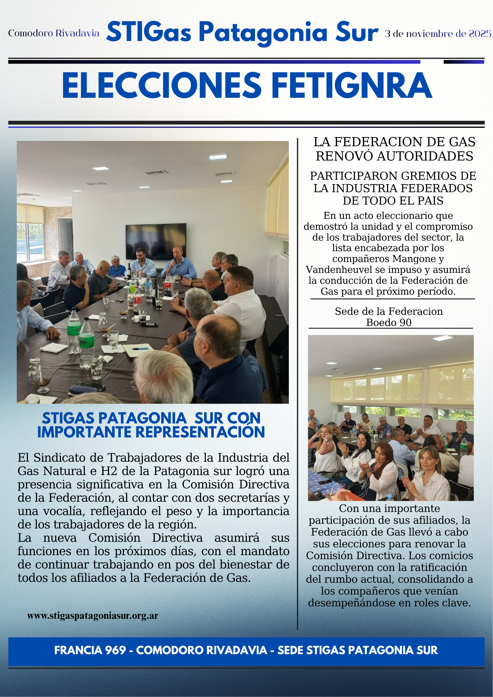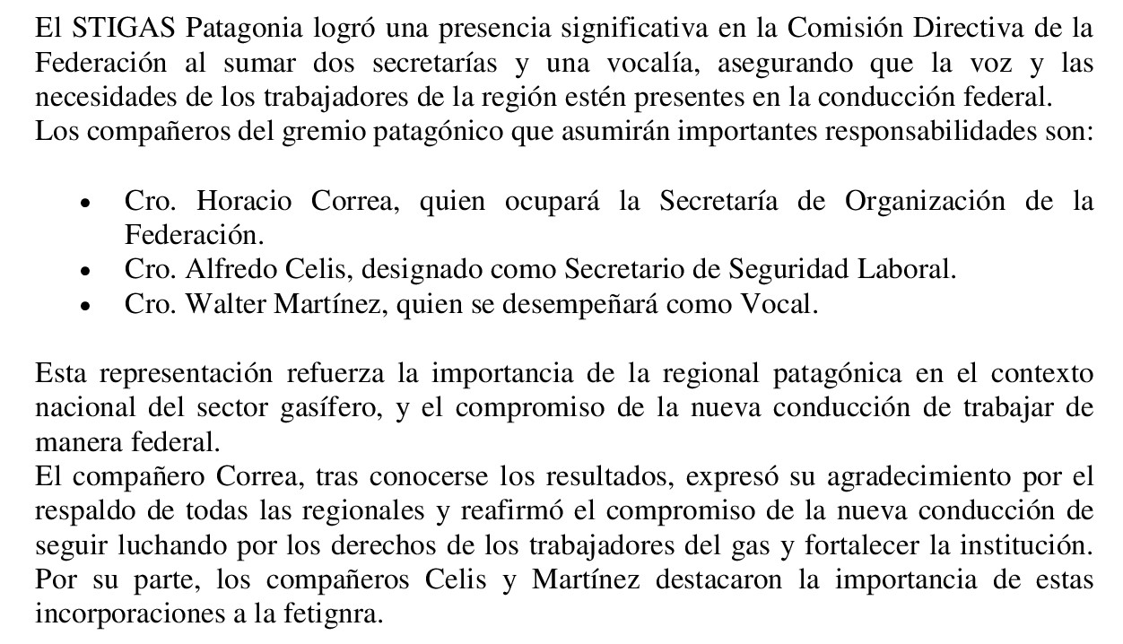 La Federación de Trabajadores de la Industria del Gas de la Republica Argentina renueva su Comisión Directiva.