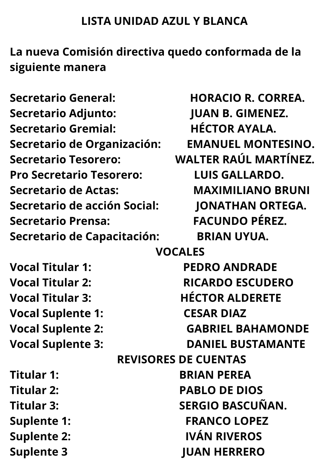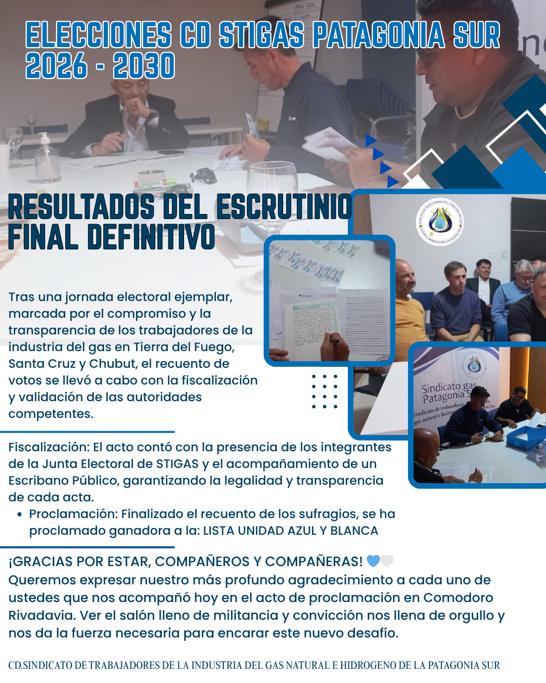 La Comisión Directiva del STIGAS Patagonia Sur cumple en informar a todas las compañeras y compañeros afiliados que, tras la finalización del escrutinio definitivo de las elecciones celebradas el pasado 3 de marzo, se ha ratificado y proclamado ganadora a la: LISTA UNIDAD AZUL Y BLANCA