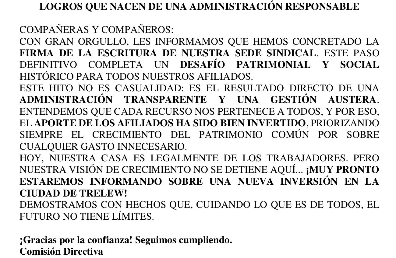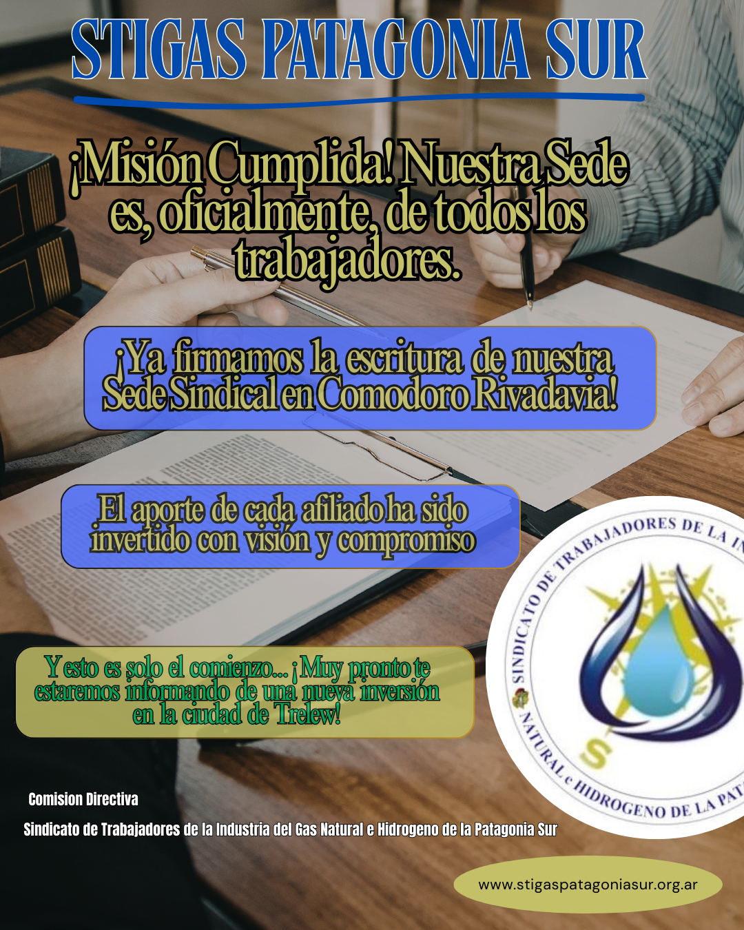 Home/Notas/SEGUIMOS CRECIENDO: Notas SEGUIMOS CRECIENDO: La sede del sindicato ya es legalmente de todos los afiliados y afiliadas. Fima y escrituración de la Sede central en la Ciudad de Comodoro Rivadavia. STIGas Patagonia Sur
