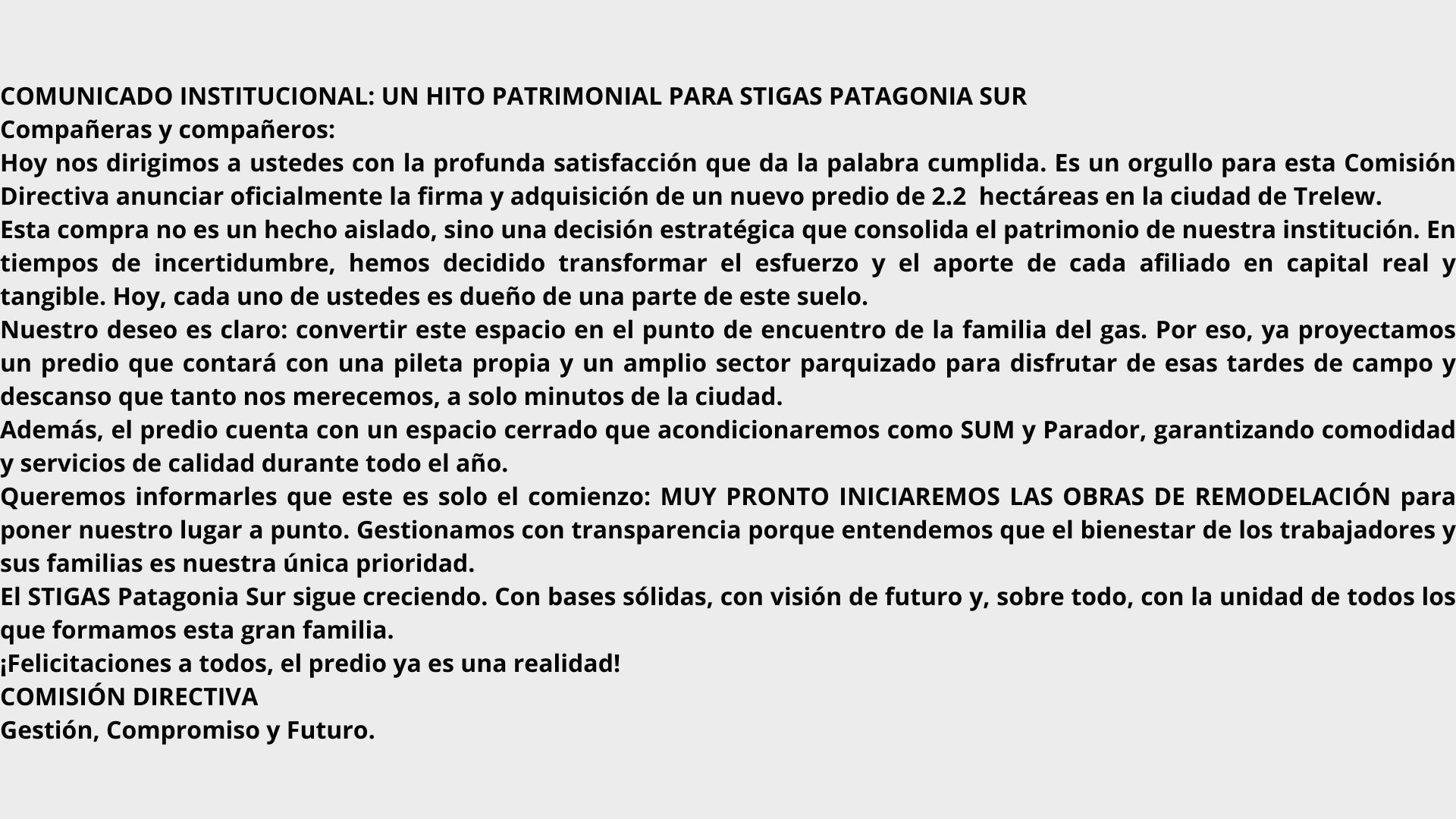 Home/Notas/¡UN SUEÑO QUE TOMA FORMA EN TRELEW! Notas ¡UN SUEÑO QUE TOMA FORMA EN TRELEW! ¡Ya es oficial la compra de nuestro nuevo predio en Trelew! Secretaria de Prensa. STIGAS PATAGONIA SUR